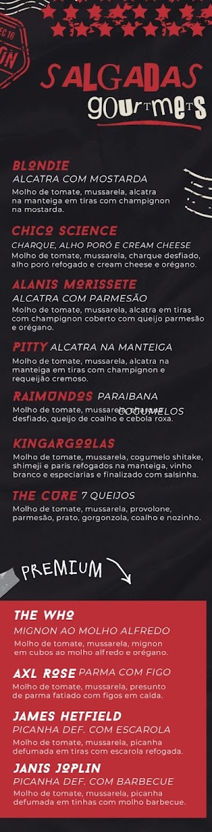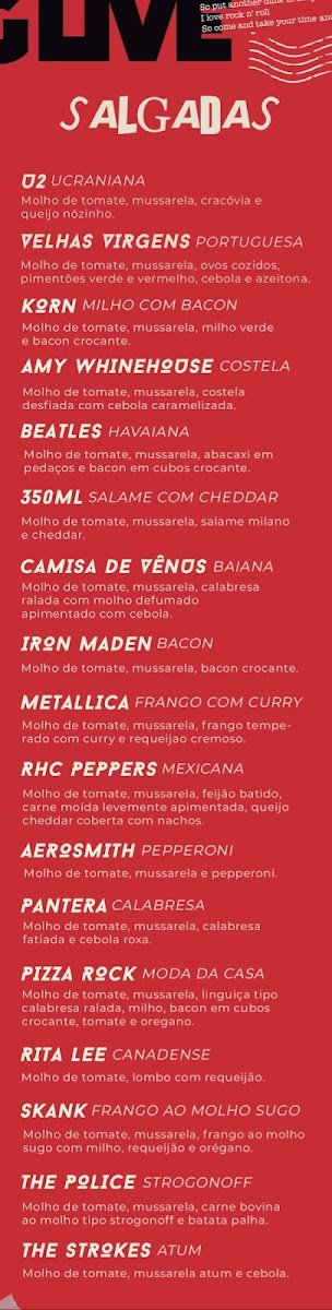 From a reviewer’s perspective, the menu at Pizza Rock Delivery is a fun, music‑inspired lineup that leans into bold flavors and playful creativity. Standouts include Pizza Mexicana - Red Hot Chilli Peppers, a zesty choice that lives up to its fiery namesake, and the classic yet robust Pizza Pepperoni - Aerosmith, which delivers familiar comfort with a rock‑and‑roll twist. The savory Pizza Calabresa - Pantera offers a spicy, hearty option for cured meat lovers, while the creamy, indulgent Pizza Quatro Queijos - Led Zepplin rounds out the selection with rich, cheesy satisfaction. Though prices aren’t listed here, the menu’s thematic dish names and diverse pizza varieties make it clear that Pizza Rock Delivery aims to serve up both flavor and character in every slice.