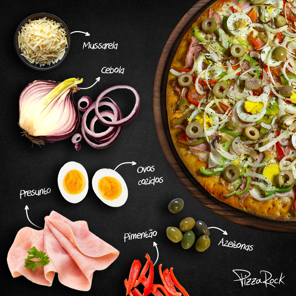 Molho de tomate, mussarela, calabresa fatiada e cebola roxa.